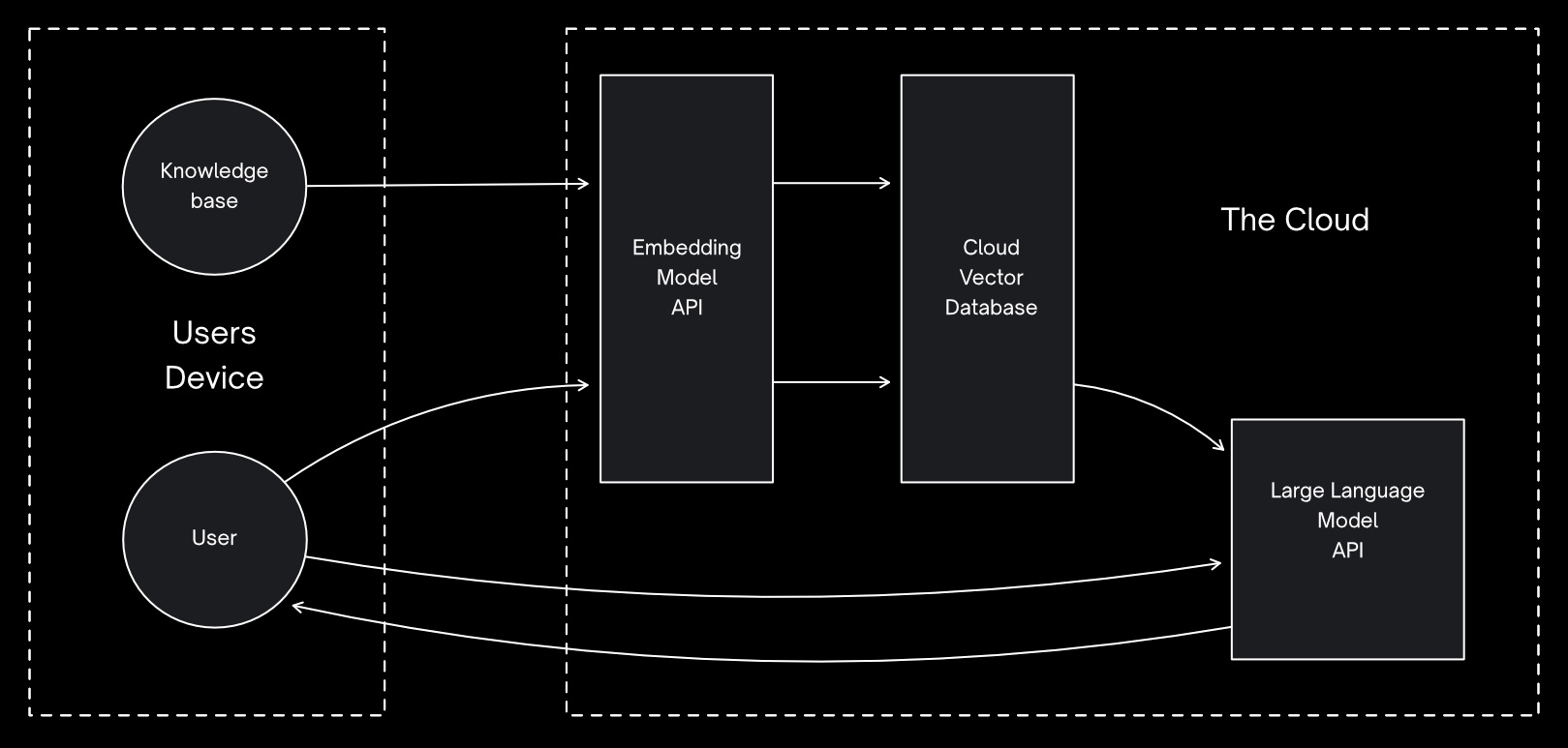 As the embedding models are significantly smaller, it is possible to have a hybrid model where the embedding model and vector database are on the user’s device, whereas the LLM is provided by a cloud API.